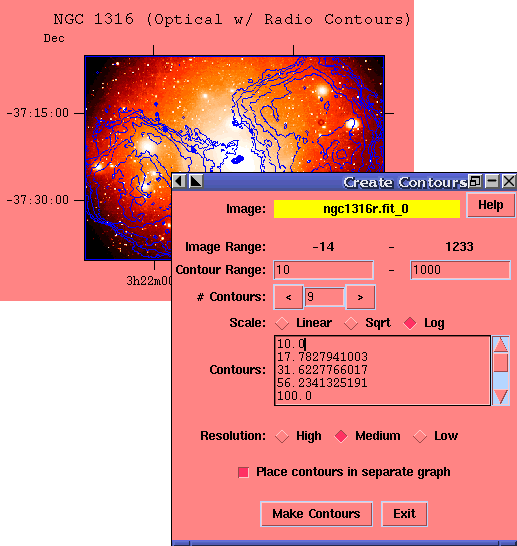 POW Contours and RegionsPOW can create contour maps of images and read/write/create standard SAO regions files. Contours:The image below shows a set of contours overlain on top of an image. The blue contours were made from a separate radio map image and then moved to this graph containing an optical image of the same object. The dialog box shows the options available for creating contours.