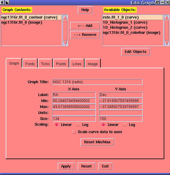 POW Graph Edit OptionsThe user can customize how a graph and its objects are displayed. Graph options:The contents of a graph can be easily changed via a pair of list boxes. The graph's labels and bounding box may be changed. The number of tick marks drawn on each axis is controlled by a sliding bar. The tick marks may optionally be connected by grid lines in a number colors and line styles. Axes can be linear or log scaling. Font styles of titles, axis labels, tick labels, and text labels can each be controlled. Curve options:Each curve in a graph can be assigned its own color, point shape/size, and line style/width. Points can filled or outlined and Lines can be drawn normally or as a histogram. Curve data can be transformed to logarithmic form for plotting in log graphs. Image options:More than 20 color maps are available. These can be inverted, scaled linearly or by a square-root or logarithmic function or by histogram equalization, and mapped to a specified range of pixel intensities. View the following animated image to see all the options available.