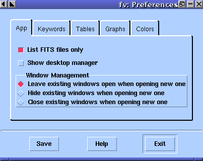 fv: User Preferences WindowThe user can configure many features within fv. Selecting the "Preferences..." menu item in any of the Edit menus brings up the below window. Preferences are grouped into the 5 categories Application, Keywords, Tables, Graphs, and Colors.